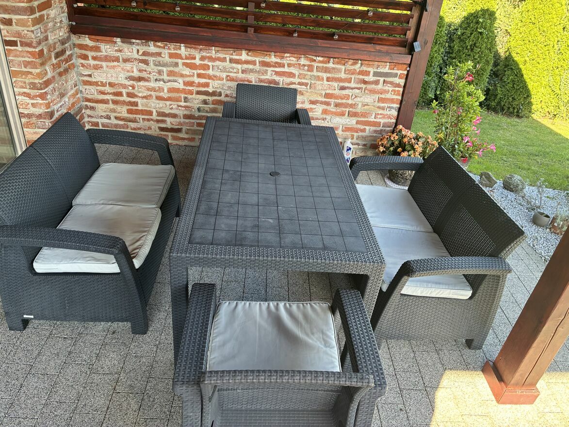 Sprzedam meble ogrodowe marki Allibert. Wysokiej jakosci techno ratan jak na zdjeciach. Komplet stol, siedziska 2xpodwojny,2xpojedynczy z poduszkami. Bardzo latwy w utrzymaniu, praktyczny, elegancki zestaw.Sprawdź zainteresowanie tym ogłoszeniem